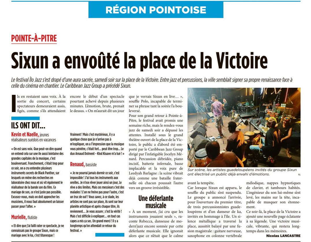 Le Caribbean Jazz Group de Jocelyn Ménard a ouvert le bal pour Sixun, lors de la soirée de clôture du Festival ÎloJazz 2025, sur la place de la Victoire à Pointe-à-Pitre. Pour l’occasion, il était formé avec Leedyah Barlagne (vcls), Jean-Michel Lesdel (pno), Fabrice Fanfant (b), Klod Kiavue (perc) et Arnaud Dolmen (dms). Nicolas Lancastre, pour France-Antilles, en a été marqué : « Pour son grand retour à Pointe-à-Pitre, le festival avait promis une semaine riche, mais le rendez-vous jazz de samedi soir a dépassé les attentes. Installé sous le grand théâtre ouvert de la place de la Victoire, le public a d’abord été emporté par le Caribbean Jazz Group dirigé par l’infatigable Jocelyn Ménard. Percussions débridées, piano incisif, batterie infernale, basse implacable et la voix pure de Leedyah Barlagne : la scène vibrait déjà comme une bataille fraternelle où chacun poussait l’autre vers un groove irrésistible. À un moment, j’ai cru que les instruments jouaient seuls, raconte Rebecca, danseuse de modern’ jazz encore sonnée par cette déferlante musicale. »